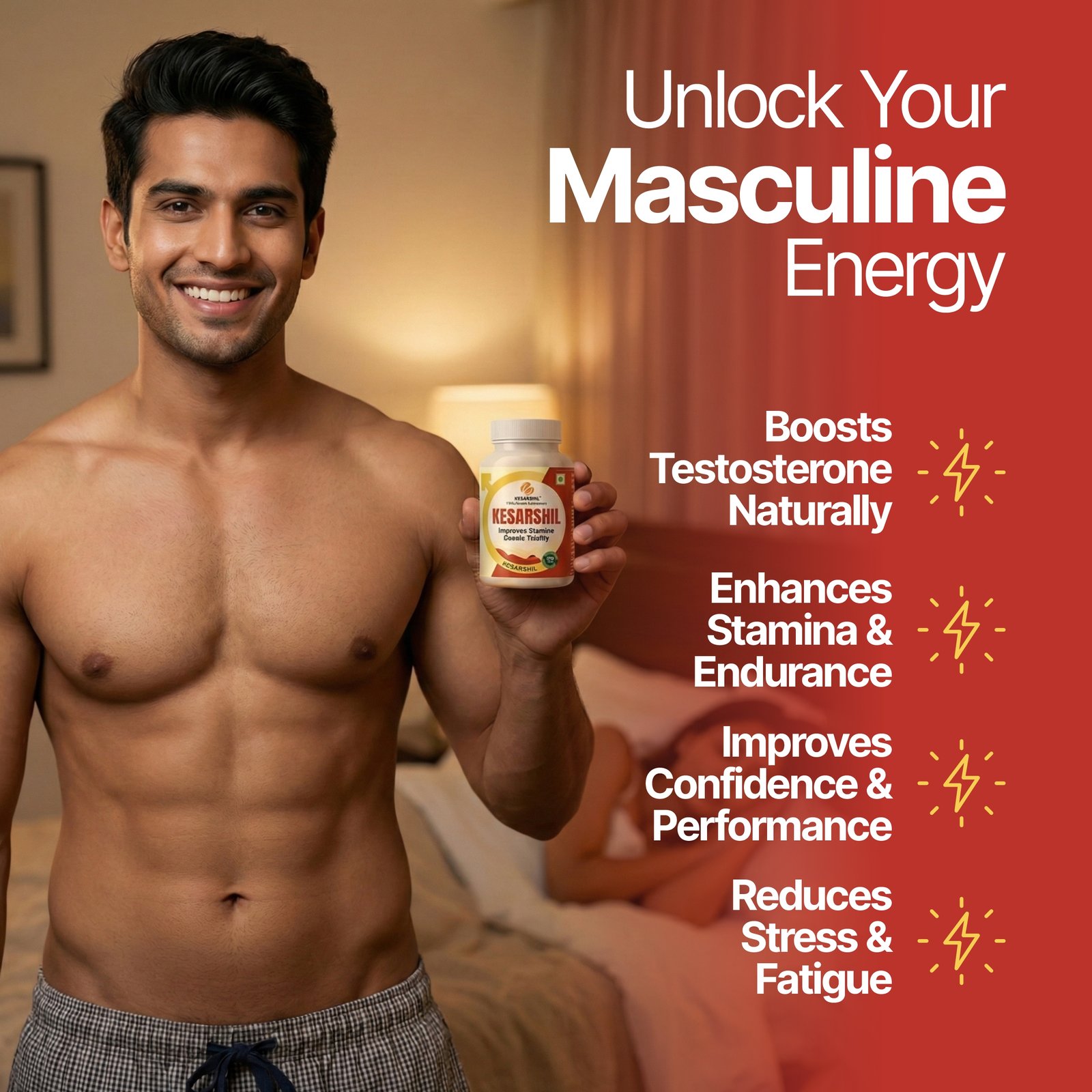 This scientifically backed formulation includes Shilajit Extract, KSM-66 Ashwagandha, Safed Musli, Gokhru, Kaunch Beej, Fenugreek, Ashwagandha, Shatavari, Kapur Kachri, and Zinc, which work synergistically to support testosterone levels, improve libido, reduce stress, and promote lean muscle strength.