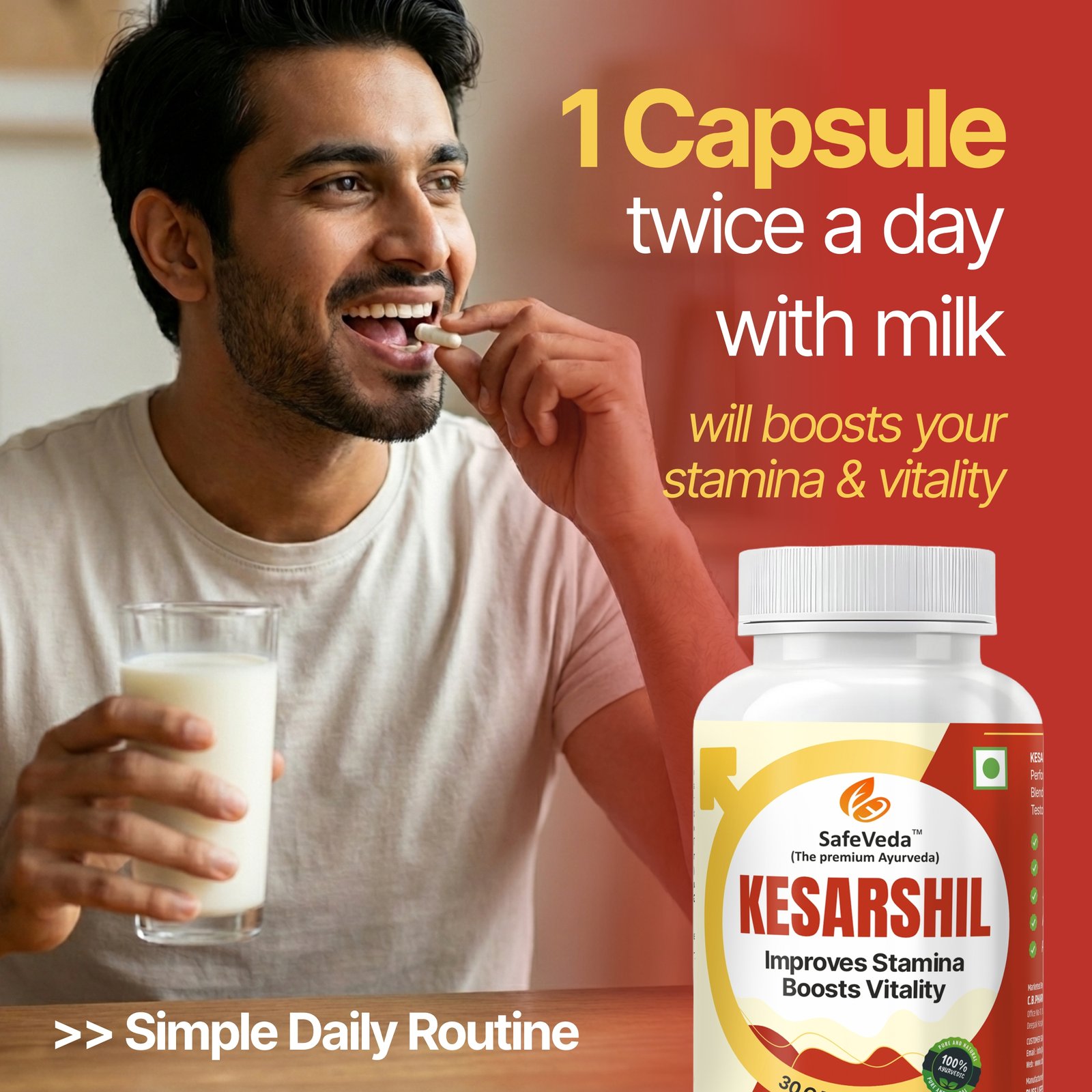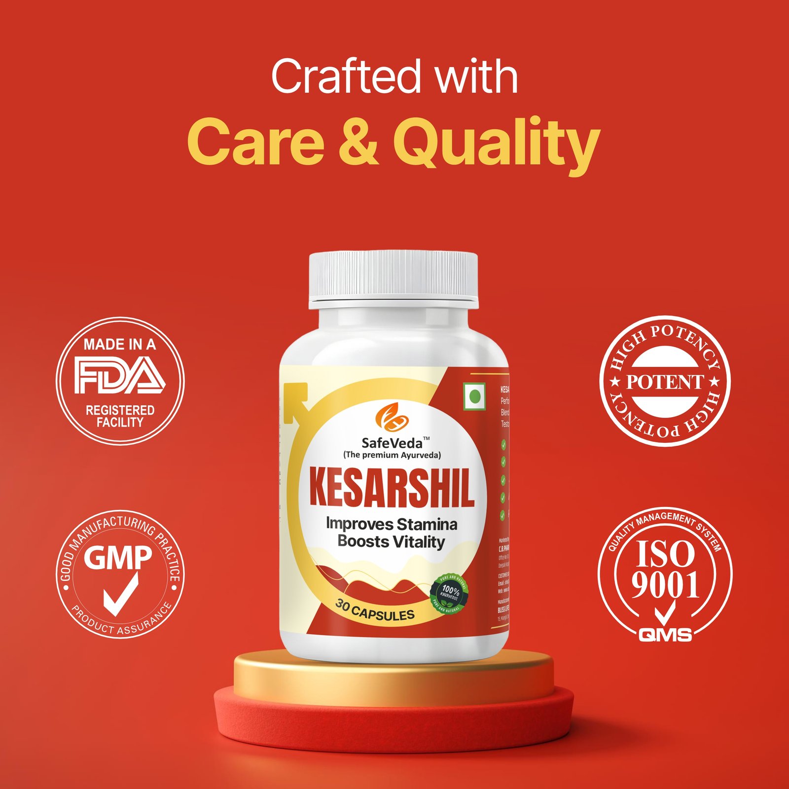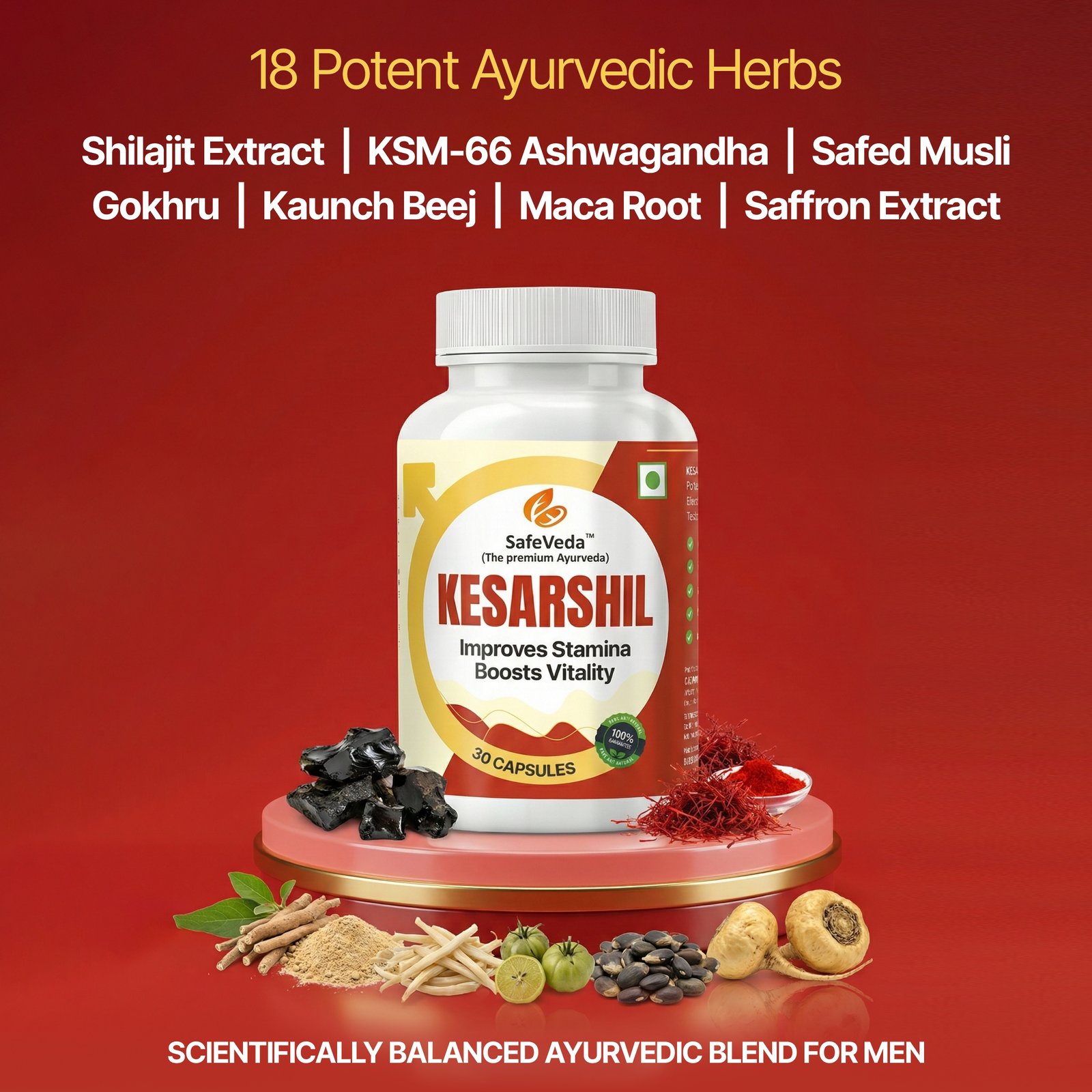 Kesarshil is a premium Ayurvedic proprietary medicine formulated to support male energy, stamina, performance, and overall vitality. Crafted by SafeVeda (The Premium Ayurveda), Kesarshil is manufactured in USFDA-approved facilities under strict quality standards, ensuring purity, safety, and global manufacturing compliance. This advanced formulation contains a powerful blend of 18 potent Ayurvedic herbs designed to enhance endurance, confidence, and masculine strength naturally.
